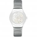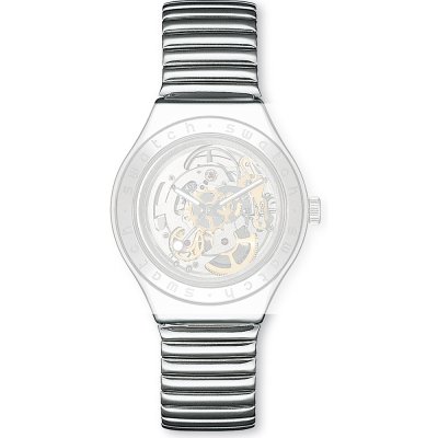 Esta bracelete de relógio Swatch é feita de aço inoxidável e está fixada ao relógio através de pinos em aço. A bracelete tem uma largura de 17 mm. A bracelete não tem uma montagem a direito, o que significa que esta bracelete só é adequada para os relógios listados abaixo.