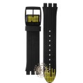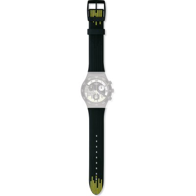 Esta bracelete de relógio Swatch é feita de silicone e está fixada ao relógio através de pinos em aço. A bracelete tem uma largura de 19.7 mm e fecha através de fecho. A bracelete não tem uma montagem a direito, o que significa que esta bracelete só é adequada para os relógios listados abaixo.