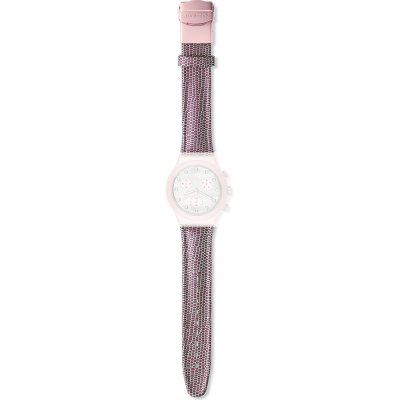 Esta bracelete de relógio Swatch é feita de couro e está fixada ao relógio através de pinos em aço. A bracelete tem uma largura de 19.7 mm e fecha através de fivela dobrável com botões de pressão e segurança. A bracelete não tem uma montagem a direito, o que significa que esta bracelete só é adequada para os relógios listados abaixo.