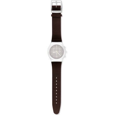 Esta bracelete de relógio Swatch é feita de couro e está fixada ao relógio através de pinos em aço. A bracelete tem uma largura de 19.7 mm e fecha através de fecho. A bracelete não tem uma montagem a direito, o que significa que esta bracelete só é adequada para os relógios listados abaixo.