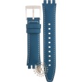 Esta bracelete de relógio Swatch é feita de couro e está fixada ao relógio através de pinos em aço. A bracelete tem uma largura de 18.1 mm e fecha através de fecho. A bracelete não tem uma montagem a direito, o que significa que esta bracelete só é adequada para os relógios listados abaixo.