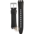 Esta bracelete de relógio Swatch é feita de couro e está fixada ao relógio através de pinos em aço. A bracelete tem uma largura de 18.1 mm e fecha através de fecho. A bracelete não tem uma montagem a direito, o que significa que esta bracelete só é adequada para os relógios listados abaixo.
