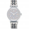 Esta bracelete de relógio Swatch é feita de alumínio e está fixada ao relógio através de pinos em aço. A bracelete tem uma largura de 18.1 mm e fecha através de fivela dobrável com botões de pressão e segurança. A bracelete não tem uma montagem a direito, o que significa que esta bracelete só é adequada para os relógios listados abaixo.