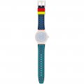 Esta bracelete de relógio Swatch é feita de silicone e está fixada ao relógio através de pinos em aço. A bracelete tem uma largura de 18.1 mm e fecha através de fecho. A bracelete não tem uma montagem a direito, o que significa que esta bracelete só é adequada para os relógios listados abaixo.