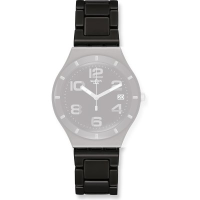 Esta bracelete de relógio Swatch é feita de alumínio e está fixada ao relógio através de pinos em aço. A bracelete tem uma largura de 17 mm e fecha através de fivela dobrável com botões de pressão e segurança. A bracelete não tem uma montagem a direito, o que significa que esta bracelete só é adequada para os relógios listados abaixo.