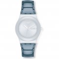 Esta bracelete de relógio Swatch é feita de alumínio e está fixada ao relógio através de pinos em aço. A bracelete tem uma largura de 17 mm e fecha através de fivela butterfly invisível. A bracelete não tem uma montagem a direito, o que significa que esta bracelete só é adequada para os relógios listados abaixo.