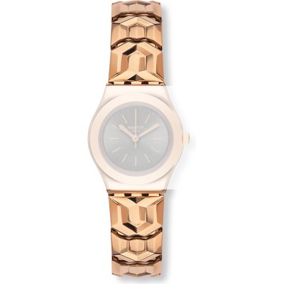 Esta bracelete de relógio Swatch é feita de aço inoxidável e está fixada ao relógio através de pinos em aço. A bracelete tem uma largura de 12 mm. A bracelete não tem uma montagem a direito, o que significa que esta bracelete só é adequada para os relógios listados abaixo.