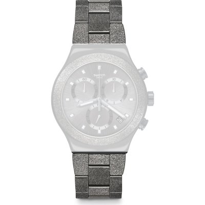 Esta bracelete de relógio Swatch é feita de aço inoxidável e está fixada ao relógio através de pinos em aço. A bracelete tem uma largura de 21 mm e fecha através de fivela butterfly com botões de pressão. A bracelete não tem uma montagem a direito, o que significa que esta bracelete só é adequada para os relógios listados abaixo.