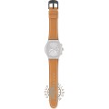 Esta bracelete de relógio Swatch é feita de couro e está fixada ao relógio através de pinos em aço. A bracelete tem uma largura de 21 mm e fecha através de fecho. A bracelete não tem uma montagem a direito, o que significa que esta bracelete só é adequada para os relógios listados abaixo.