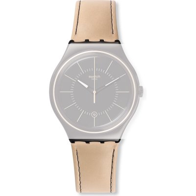 Esta bracelete de relógio Swatch é feita de couro e está fixada ao relógio através de pinos em aço. A bracelete tem uma largura de 18.9 mm e fecha através de fivela desdobrável. A bracelete não tem uma montagem a direito, o que significa que esta bracelete só é adequada para os relógios listados abaixo.
