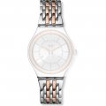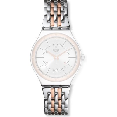 Esta bracelete de relógio Swatch é feita de aço inoxidável e está fixada ao relógio através de pinos em aço. A bracelete tem uma largura de 18.9 mm e fecha através de fivela dobrável com botões de pressão e segurança. A bracelete não tem uma montagem a direito, o que significa que esta bracelete só é adequada para os relógios listados abaixo.