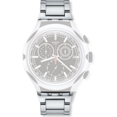 Esta bracelete de relógio Swatch é feita de alumínio e está fixada ao relógio através de pinos em aço. A bracelete tem uma largura de 19.7 mm e fecha através de fivela dobrável com segurança. A bracelete não tem uma montagem a direito, o que significa que esta bracelete só é adequada para os relógios listados abaixo.