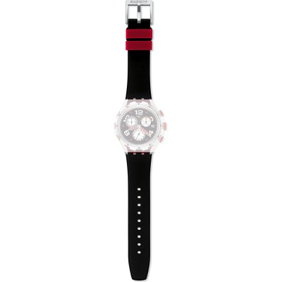 Esta bracelete de relógio Swatch é feita de silicone e está fixada ao relógio através de pinos em aço. A bracelete tem uma largura de 19.7 mm e fecha através de fecho. A bracelete não tem uma montagem a direito, o que significa que esta bracelete só é adequada para os relógios listados abaixo.