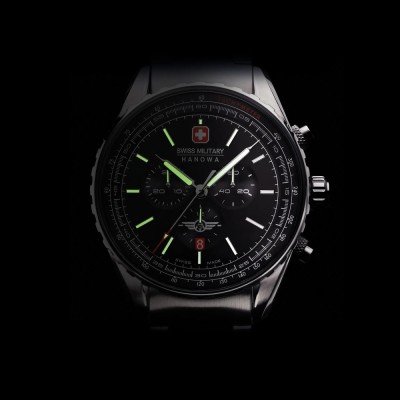 O relógio é estanque a 10ATM. Isto significa que o relógio é adaptado à natação. O relógio tem Swiss Military 3+2.