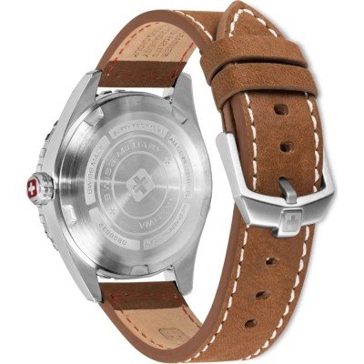 Este relógio Swiss Military Hanowa tem uma caixa de Inox com um diâmetro de 44 mm e está equipado com uma bracelete de couro. A caixa possui um movimento Ronda e o relógio tem um vidro Safira.