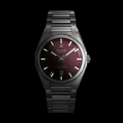 O relógio é estanque a 10ATM. Isto significa que o relógio é adaptado à natação. O relógio tem Swiss Military 3+2.