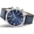 Este relógio Swiss Military Hanowa tem uma caixa de Inox com um diâmetro de 44 mm e está equipado com uma bracelete de couro. A caixa possui um movimento ISA e o relógio tem um vidro Safira.