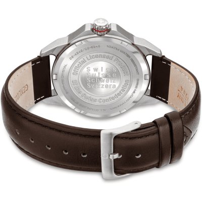 Este relógio Swiss Military Hanowa tem uma caixa de Inox com um diâmetro de 45 mm e está equipado com uma bracelete de couro. A caixa possui um movimento Ronda e o relógio tem um vidro Safira.