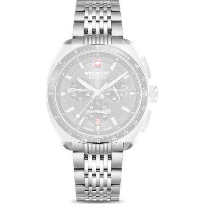 Esta bracelete de relógio Swiss Military Hanowa é feita de aço inoxidável e está fixada ao relógio através de pinos de pressão. A bracelete tem uma largura de 20 mm e fecha através de fivela dobrável com botões de pressão e segurança. A bracelete não tem uma montagem a direito, o que significa que esta bracelete só é adequada para os relógios listados abaixo.