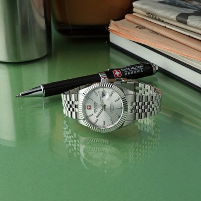 Este relógio Swiss Military Hanowa tem uma caixa de Inox com um diâmetro de 41 mm e está equipado com uma bracelete de Inox. A caixa possui um movimento Soprod e o relógio tem um vidro Safira.