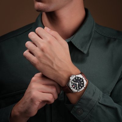 Este relógio Swiss Military Hanowa tem uma caixa de Inox com um diâmetro de 42 mm e está equipado com uma bracelete de couro. A caixa possui um movimento Ronda e o relógio tem um vidro Safira.