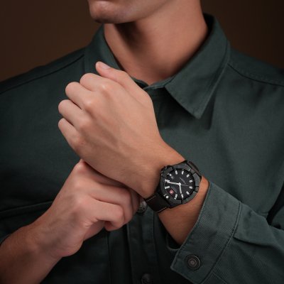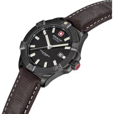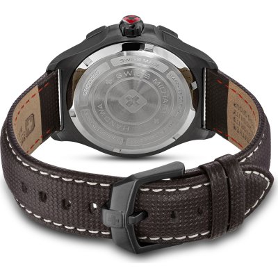 Este relógio Swiss Military Hanowa tem uma caixa de Inox com um diâmetro de 42 mm e está equipado com uma bracelete de couro. A caixa possui um movimento Ronda e o relógio tem um vidro Safira.
