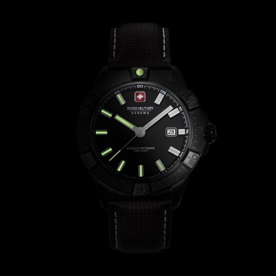 O relógio é estanque a 10ATM. Isto significa que o relógio é adaptado à natação. O relógio tem Swiss Military 3+2.