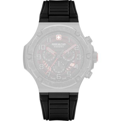 Esta bracelete de relógio Swiss Military Hanowa é feita de silicone e está fixada ao relógio através de pinos em aço. A bracelete tem uma largura de 26 mm e fecha através de fecho. A bracelete não tem uma montagem a direito, o que significa que esta bracelete só é adequada para os relógios listados abaixo.