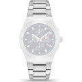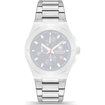 Esta bracelete de relógio Swiss Military Hanowa é feita de aço inoxidável e está fixada ao relógio através de pinos em aço. A bracelete tem uma largura de 26 mm e fecha através de fivela dobrável com botões de pressão e segurança. A bracelete não tem uma montagem a direito, o que significa que esta bracelete só é adequada para os relógios listados abaixo.