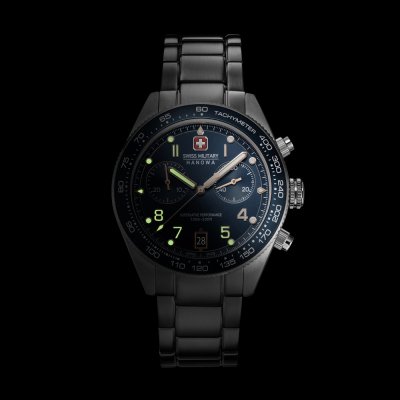 O relógio é estanque a 10ATM. Isto significa que o relógio é adaptado à natação. O relógio tem Swiss Military 3+2.