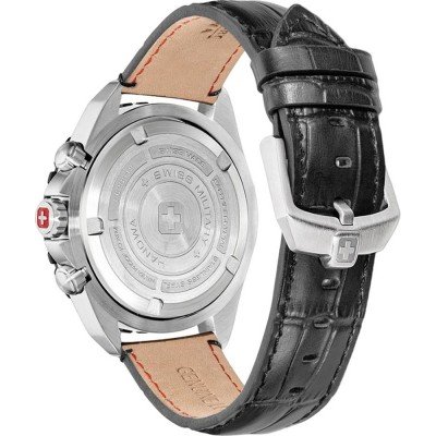 Este relógio Swiss Military Hanowa tem uma caixa de Inox com um diâmetro de 45 mm e está equipado com uma bracelete de couro. A caixa possui um movimento Ronda e o relógio tem um vidro Safira.