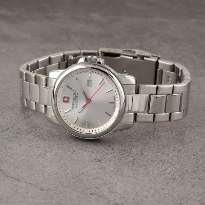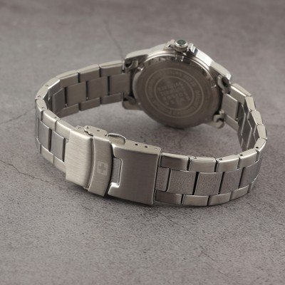 Este relógio Swiss Military Hanowa tem uma caixa de Inox com um diâmetro de 32 mm e está equipado com uma bracelete de Inox. A caixa possui um movimento Ronda e o relógio tem um vidro Safira.