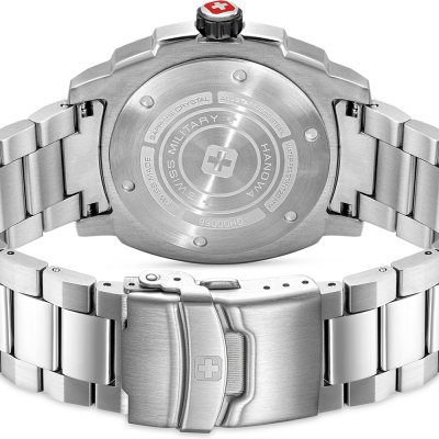 Este relógio Swiss Military Hanowa tem uma caixa de Inox com um diâmetro de 40 mm e está equipado com uma bracelete de Inox. A caixa possui um movimento Ronda e o relógio tem um vidro Safira.