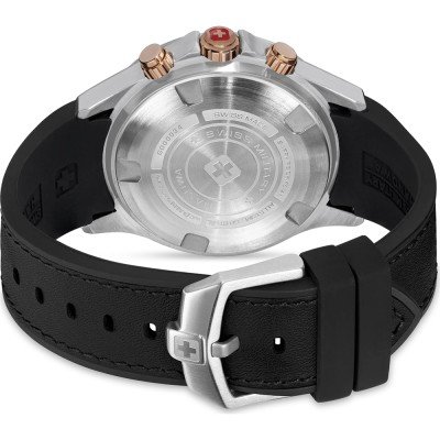 Este relógio Swiss Military Hanowa tem uma caixa de Inox com um diâmetro de 43 mm e está equipado com uma bracelete de borracha. A caixa possui um movimento Ronda e o relógio tem um vidro Safira.