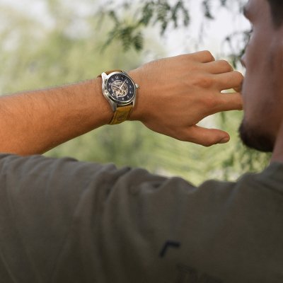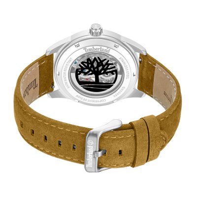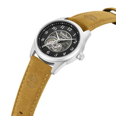 Este relógio Timberland tem uma caixa de Inox com um diâmetro de 43 mm e está equipado com uma bracelete de couro. A caixa possui um movimento Seagull e o relógio tem um vidro Mineral.