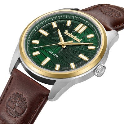 Este relógio Timberland tem uma caixa de Inox com um diâmetro de 45 mm e está equipado com uma bracelete de couro. A caixa possui um movimento Seiko e o relógio tem um vidro Mineral.