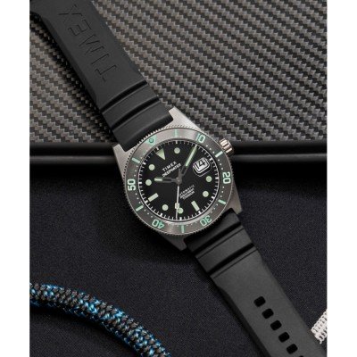 Este relógio Timex tem uma caixa de Titânio com um diâmetro de 40 mm e está equipado com uma bracelete de borracha. A caixa possui um movimento Timex e o relógio tem um vidro Safira.