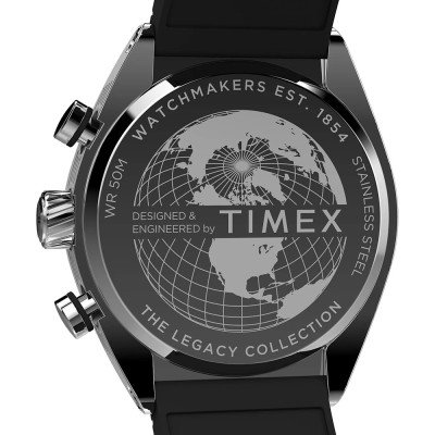Este relógio Timex tem uma caixa de Inox com um diâmetro de 42 mm e está equipado com uma bracelete de borracha. A caixa possui um movimento Timex e o relógio tem um vidro Mineral.