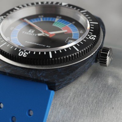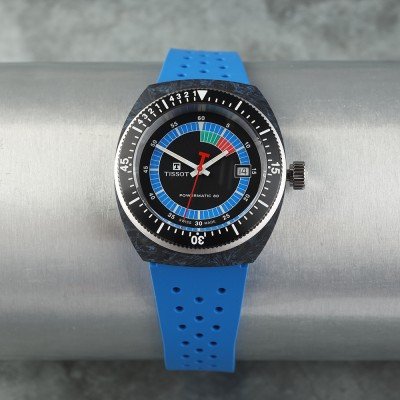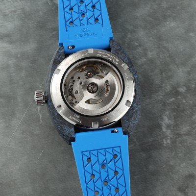 Este relógio Tissot tem uma caixa de Carbono com um diâmetro de 41 mm e está equipado com uma bracelete de borracha. A caixa possui um movimento ETA e o relógio tem um vidro Safira anti-reflexo única.
