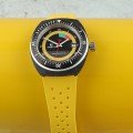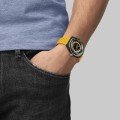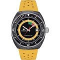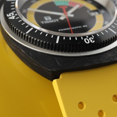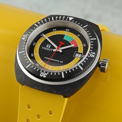 Este relógio Tissot tem uma caixa de Carbono com um diâmetro de 41 mm e está equipado com uma bracelete de borracha. A caixa possui um movimento ETA e o relógio tem um vidro Safira anti-reflexo única.