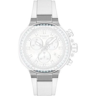 Esta bracelete de relógio Tissot é feita de silicone e está fixada ao relógio através de parafuso de sela. A bracelete tem uma largura de 17 mm e fecha através de fecho. A bracelete não tem uma montagem a direito, o que significa que esta bracelete só é adequada para os relógios listados abaixo.