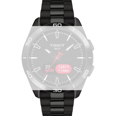 Esta bracelete de relógio Tissot é feita de titânio e está fixada ao relógio através de pinos carregados por mola de liberação rápida. A bracelete tem uma largura de 21 mm e fecha através de fivela dobrável com botões de pressão. A bracelete não tem uma montagem a direito, o que significa que esta bracelete só é adequada para os relógios listados abaixo.