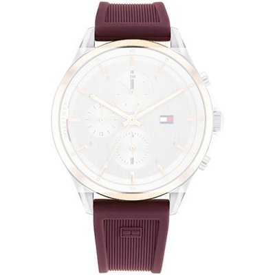 Esta bracelete de relógio Tommy Hilfiger é feita de silicone e está fixada ao relógio através de pinos de pressão. A bracelete tem uma largura de 18 mm e fecha através de fecho. A bracelete tem uma montagem a direito, o que significa que esta bracelete é adequada para todos os relógios Tommy Hilfiger com montagem da bracelete a direito.