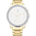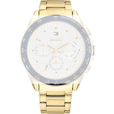 Esta bracelete de relógio Tommy Hilfiger é feita de aço inoxidável e está fixada ao relógio através de pinos de pressão. A bracelete tem uma largura de 22 mm e fecha através de fivela dobrável com botões de pressão. A bracelete não tem uma montagem a direito, o que significa que esta bracelete só é adequada para os relógios listados abaixo.