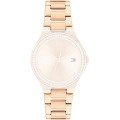 Esta bracelete de relógio Tommy Hilfiger é feita de aço inoxidável e está fixada ao relógio através de pinos de pressão. A bracelete tem uma largura de 20 mm e fecha através de fivela dobrável com botões de pressão. A bracelete não tem uma montagem a direito, o que significa que esta bracelete só é adequada para os relógios listados abaixo.