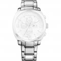 Esta bracelete de relógio Tommy Hilfiger é feita de aço inoxidável e está fixada ao relógio através de pinos de pressão. A bracelete tem uma largura de 22 mm e fecha através de fivela dobrável com botões de pressão. A bracelete não tem uma montagem a direito, o que significa que esta bracelete só é adequada para os relógios listados abaixo.