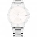 Esta bracelete de relógio Tommy Hilfiger é feita de aço inoxidável e está fixada ao relógio através de pinos em aço. A bracelete tem uma largura de 20 mm e fecha através de fivela dobrável com botões de pressão. A bracelete não tem uma montagem a direito, o que significa que esta bracelete só é adequada para os relógios listados abaixo.