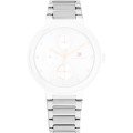 Esta bracelete de relógio Tommy Hilfiger é feita de aço inoxidável e está fixada ao relógio através de pinos de pressão. A bracelete tem uma largura de 18 mm e fecha através de fivela dobrável com botões de pressão. A bracelete não tem uma montagem a direito, o que significa que esta bracelete só é adequada para os relógios listados abaixo.