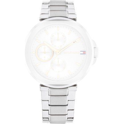 Esta bracelete de relógio Tommy Hilfiger é feita de aço inoxidável e está fixada ao relógio através de pinos em aço. A bracelete tem uma largura de 19 mm e fecha através de fivela dobrável com botões de pressão. A bracelete não tem uma montagem a direito, o que significa que esta bracelete só é adequada para os relógios listados abaixo.