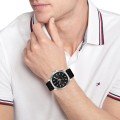 Este relógio Tommy Hilfiger tem uma caixa de Inox com um diâmetro de 43 mm e está equipado com uma bracelete de couro. A caixa possui um movimento Seiko e o relógio tem um vidro Mineral.